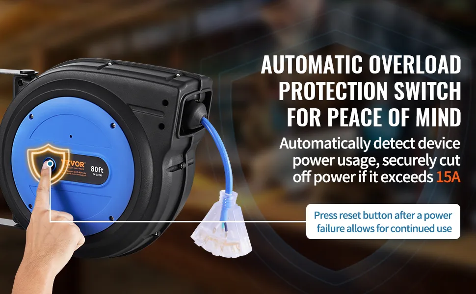 Protección contra sobrecargas para mayor tranquilidad: nuestro carrete de cable de extensión retráctil, probado rigurosamente para garantizar la seguridad eléctrica, la vida útil del disyuntor y la funcionalidad de encendido y apagado, protege sus dispositivos contra cortocircuitos y sobrecargas. Corta automáticamente la energía si el uso supera los 15 A, lo que garantiza el funcionamiento seguro de sus herramientas eléctricas.