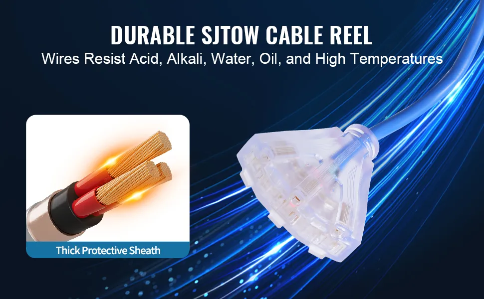 Fabricado con cable SJTOW de primera calidad, nuestro carrete de cable de extensión retráctil ofrece protección y durabilidad inigualables para exteriores. Perfecto para cualquier entorno difícil, garantiza que su energía se mantenga confiable dondequiera que vaya.