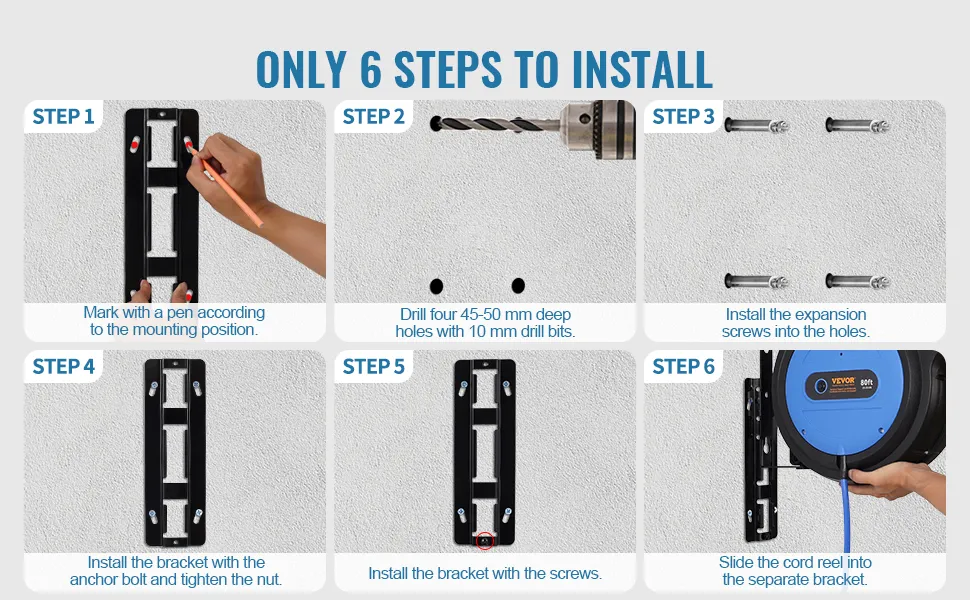 Monte fácilmente nuestro carrete de cable retráctil en la pared o el techo con el soporte, las instrucciones detalladas y los tornillos. Nota: No se necesitan tornillos para el montaje en la pared, pero sí para la instalación en el techo, así que asegúrese de colocar los tornillos correctamente para evitar que el carrete se caiga.