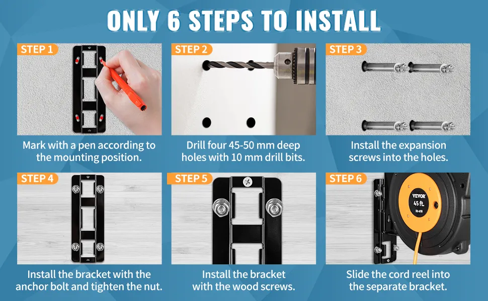 Monte rápidamente el carrete del cable de alimentación retráctil en la pared o el techo con un soporte independiente para facilitar su uso en cualquier trabajo. Viene con un soporte de montaje detallado y los modelos de tornillos del tamaño adecuado para una fácil instalación y extracción. También le brinda la comodidad de trabajar en cualquier dirección.