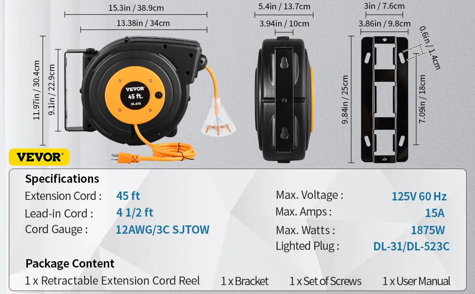Con el cable de extensión de 13,7 metros (45 pies) y el cable de alimentación de 1,4 metros (4,5 pies), tendrá mayor alcance para garajes grandes, talleres y trabajos al aire libre, y podrá alimentar sus herramientas de forma segura: 5 A, 125 V y 1875 W. Tanto si realiza trabajos por su cuenta como en un entorno profesional, este carrete retráctil es una fuente de alimentación fiable y constante para equipos como taladros, sierras y luces de trabajo.