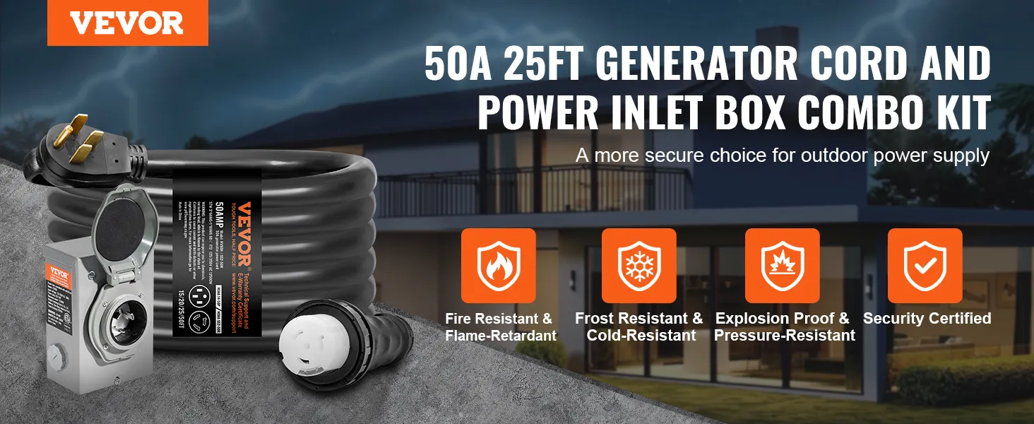 VEVOR 50 Amp Generator Cord and Power Inlet Box Kit, 25FT, NEMA 14-50P/SS2-50R STW 6/3+8/1 AWG Generator Power Cord with Twist Lock Connector, Pre-Drilled Inlet Box for Generator to House, ETL Listed