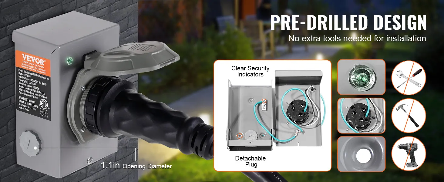 Our power inlet box features pre-drilled holes with a detachable plug for easy installation—no need for drills or screwdrivers. Plus, the indicator light in the flip cover ensures you're always connected securely and efficiently, whether at night or in dark areas.