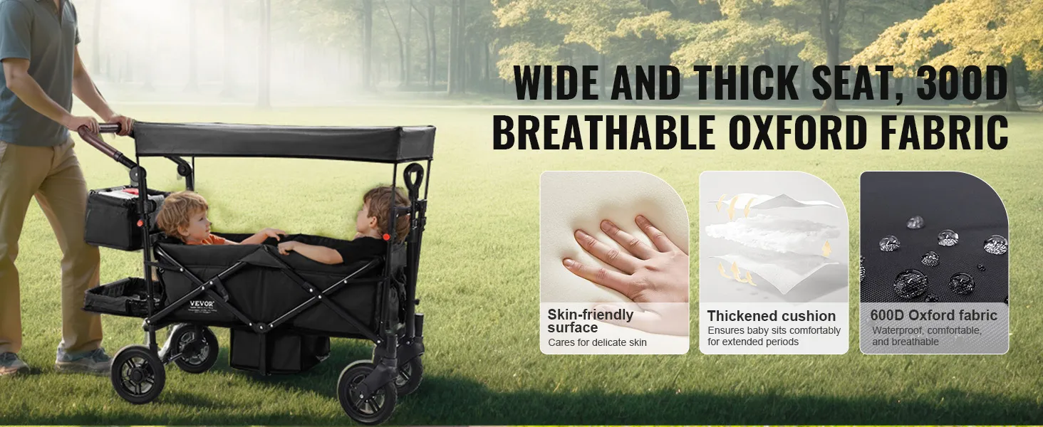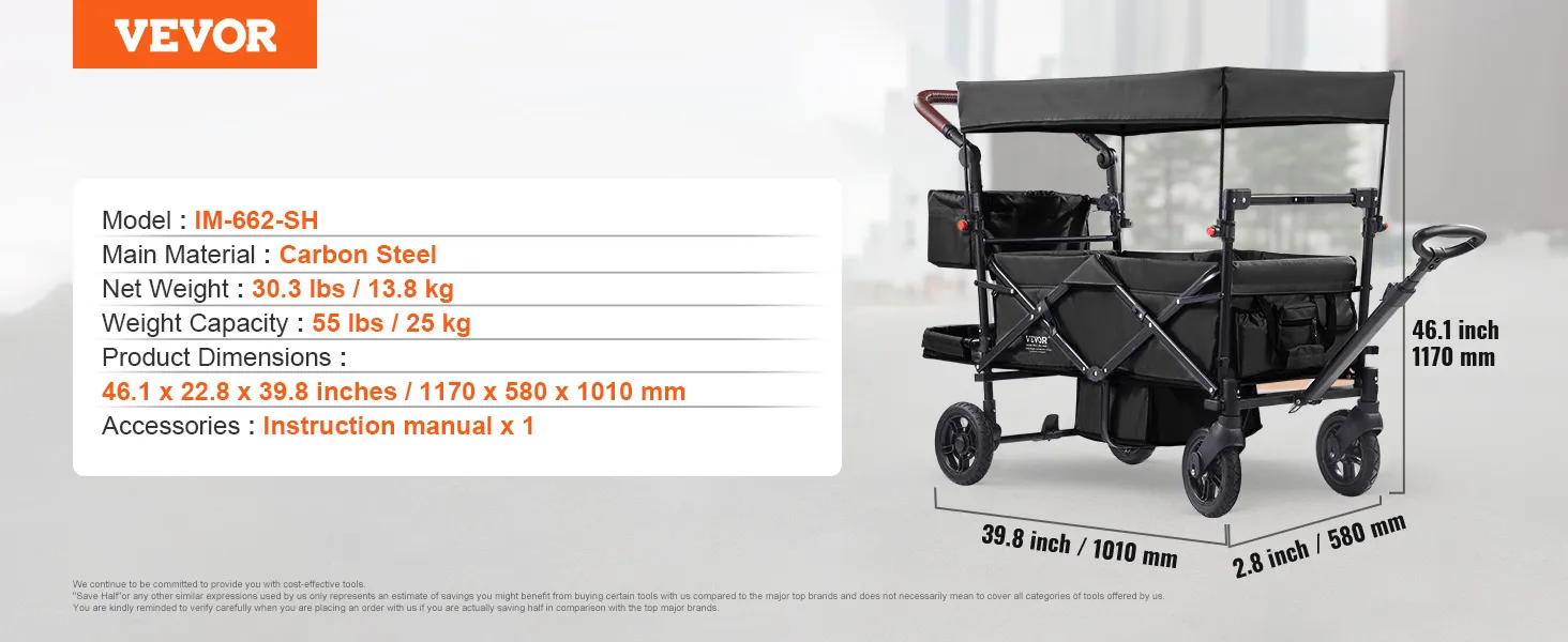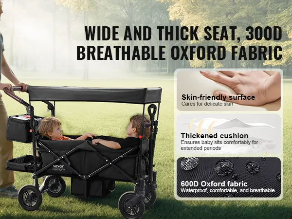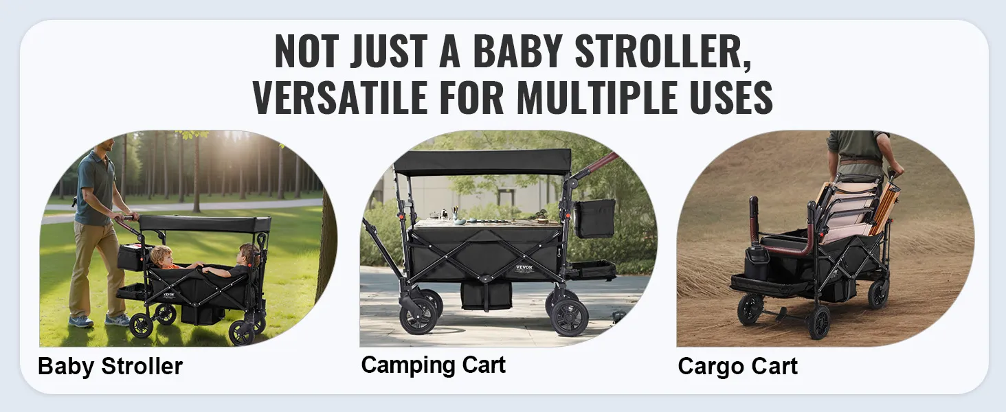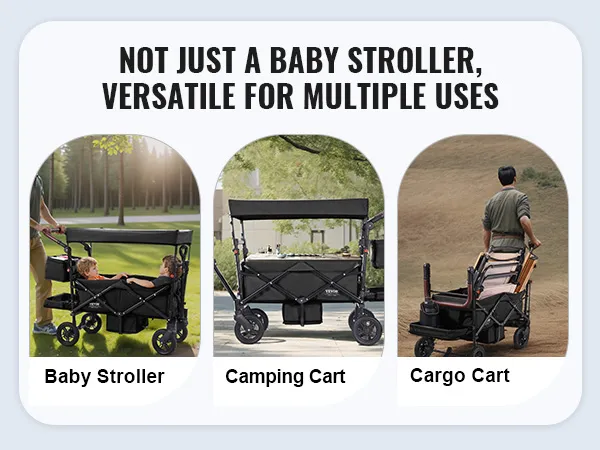 VEVOR Wagon Stroller for 2 Kids, Push Pull Quad Collapsible Stroller with Adjustable Handle, Encircling Harness Removable Canopy, 4 Wheels with Brakes, Mutifunction Tandem Stroller for Camping Black