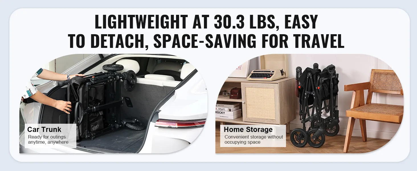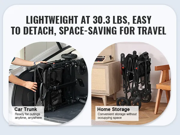 The double stroller is lightweight and easy to assemble and disassemble, making it convenient to carry. Whether you place it in the car trunk or store it at home, it won't take up much space.