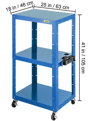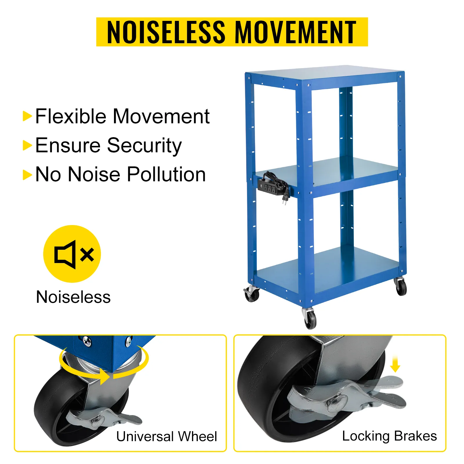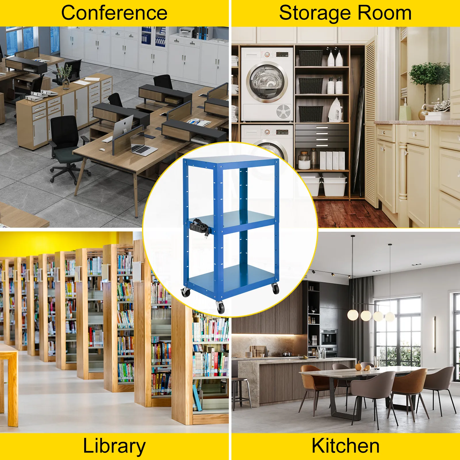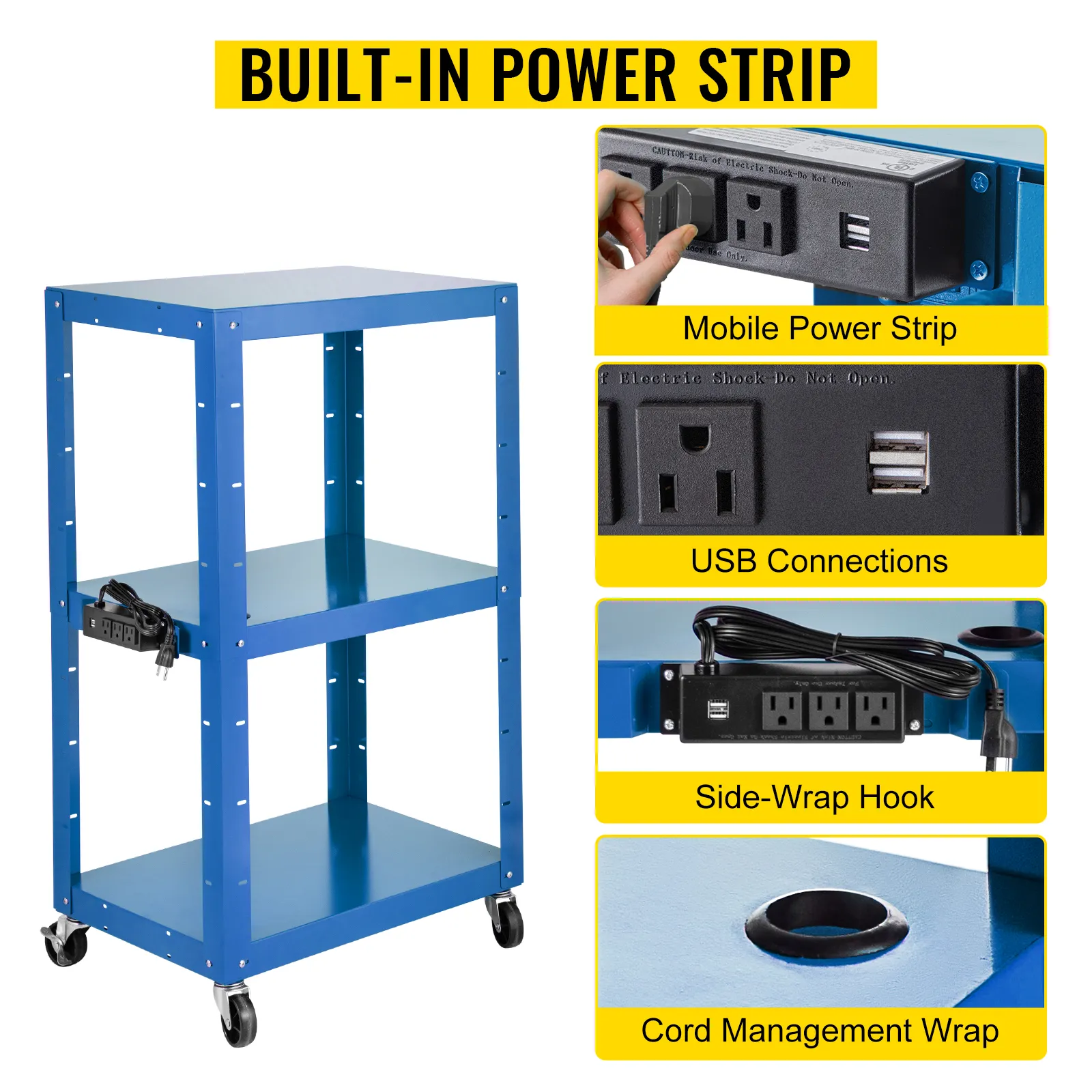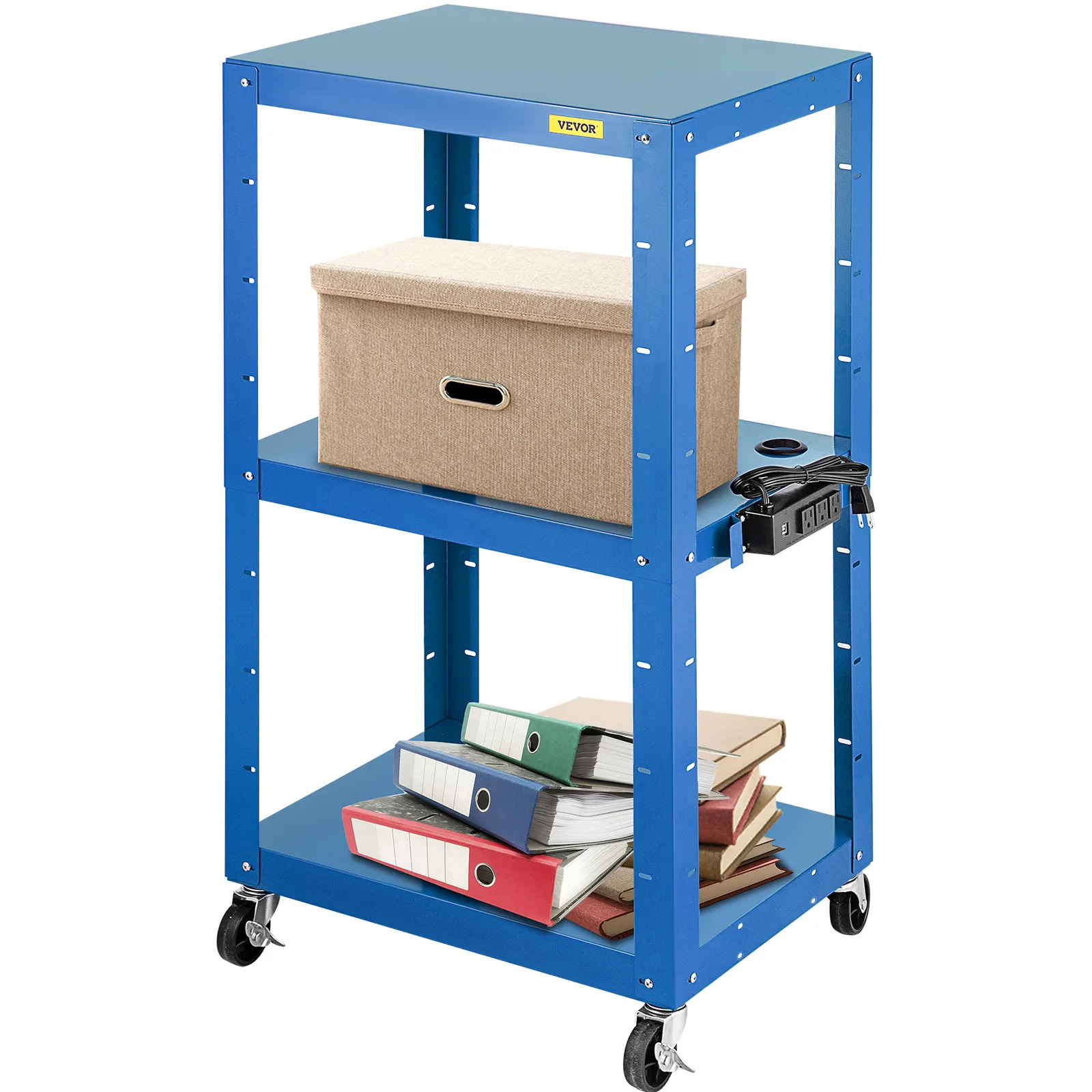 Carros AV sobre ruedas que brindan funcionalidad adicional, que están construidos con material de acero de alta resistencia. Hay 7 niveles de altura ajustable que proporcionan diferentes espacios para el almacenamiento. Además, el carro rodante de medios está equipado con una regleta de enchufes para cargar mientras está en movimiento. El carro multimedia tiene una capacidad de carga de 150 libras, que es adecuado para la cocina, el almacén, la sala de conferencias, la oficina y el aula.