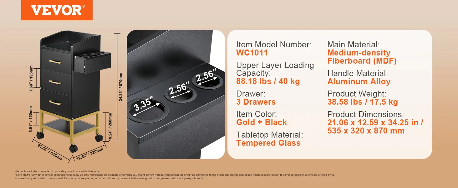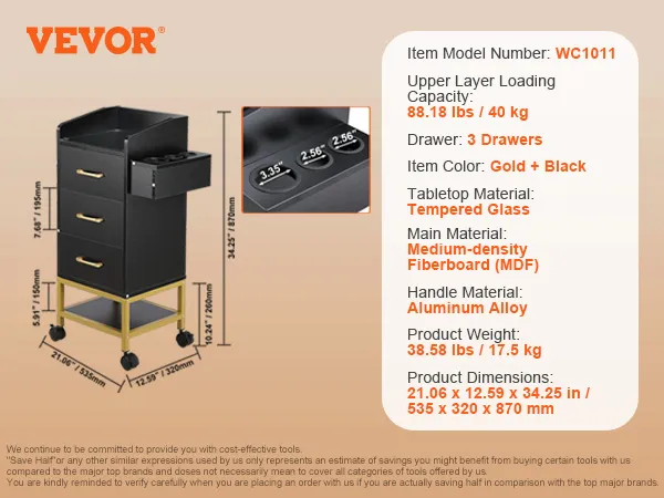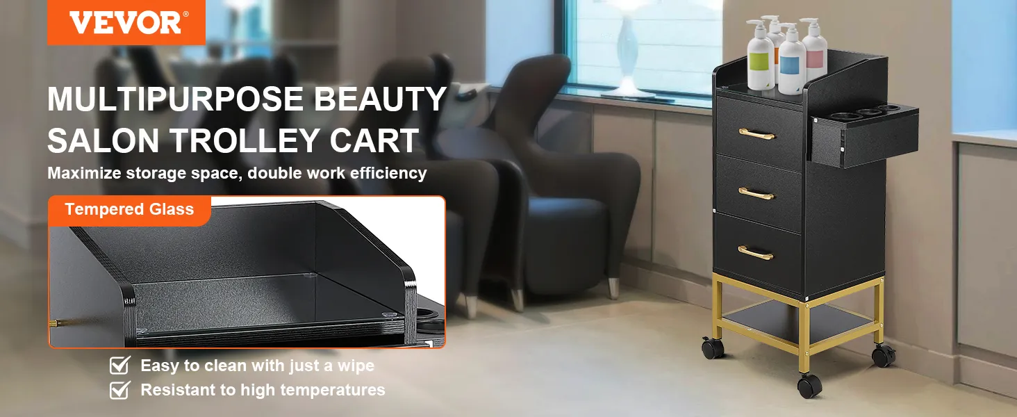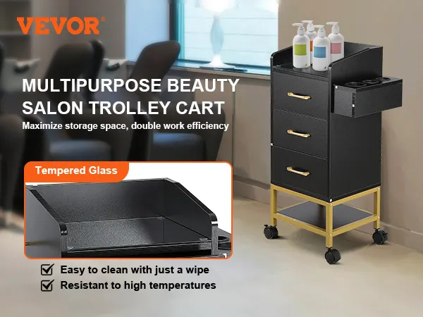 ¡Mejore su experiencia en el salón con el versátil carrito de salón de belleza VEVOR! Limpie sin esfuerzo con su tapa de vidrio templado, maximice el almacenamiento con múltiples cajones y disfrute de la durabilidad con una resistente construcción de MDF: mantenga sus herramientas organizadas y al alcance para una mayor eficiencia.