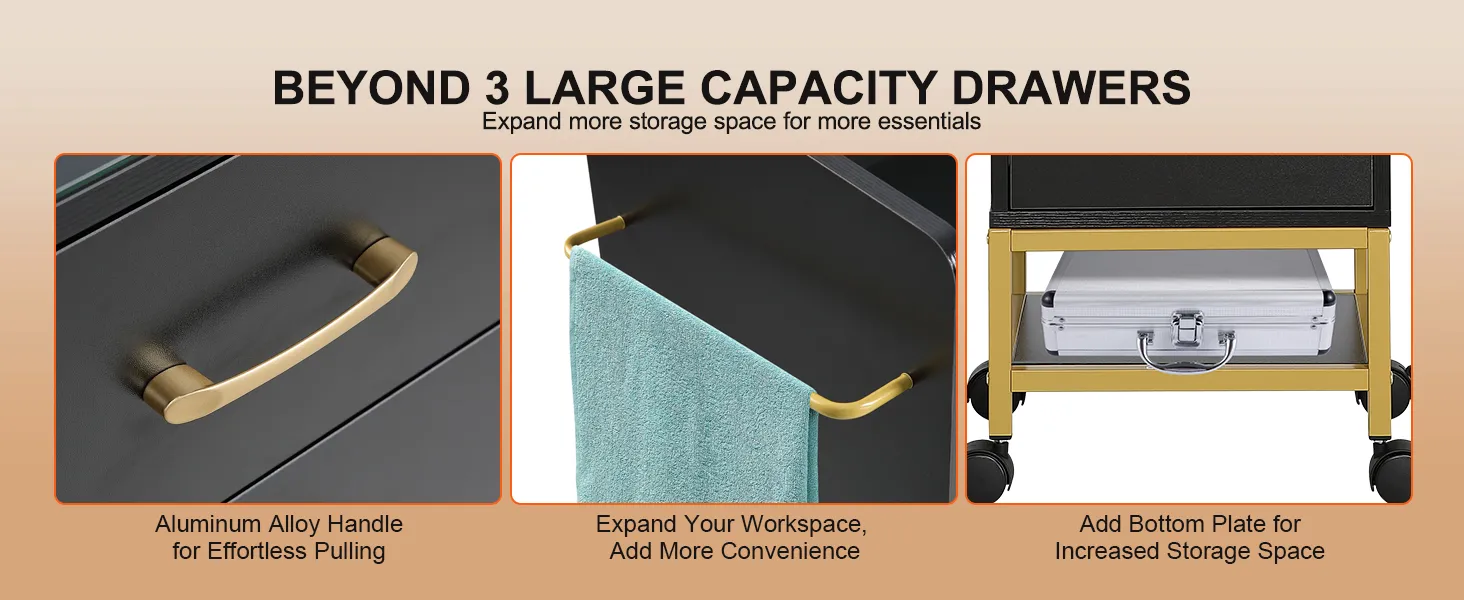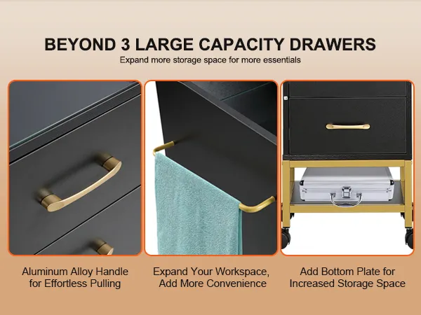 Más que solo 3 cajones, que amplían el espacio de almacenamiento en todas direcciones: ¡ya no se limita a un almacenamiento limitado! Nuestro carrito de salón con ruedas para estilistas está diseñado con más de solo 3 cajones; la adición de un tablero inferior y un toallero lateral aumenta aún más el espacio de almacenamiento para satisfacer sus necesidades.