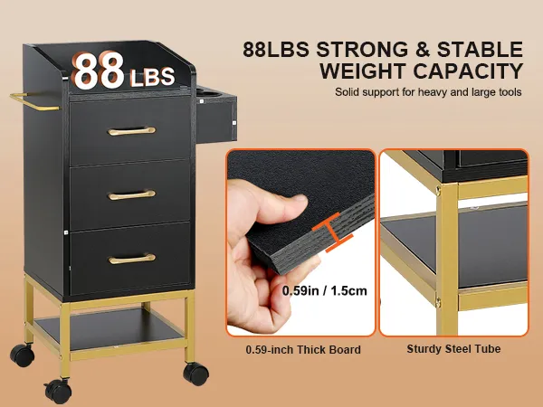 Construcción robusta: fabricado con tablero MDF resistente de 0,59 pulgadas de grosor, nuestro gabinete de almacenamiento de salón para estilistas garantiza una durabilidad y estabilidad excepcionales. La construcción del marco de acero soporta hasta 88 libras, lo que ofrece un soporte confiable para herramientas pesadas y promete una longevidad superior.