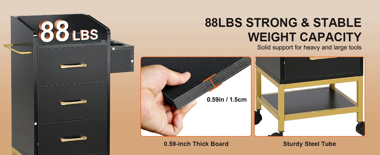 Fabricado con materiales de alta calidad, nuestro equipo de estilista sobre ruedas garantiza una excelente capacidad de carga. Utilizando un tablero MDF de 0,59 pulgadas de espesor y tubos de acero resistentes, puede colocar con confianza herramientas grandes y pesadas, lo que garantiza seguridad y estabilidad durante un uso prolongado.