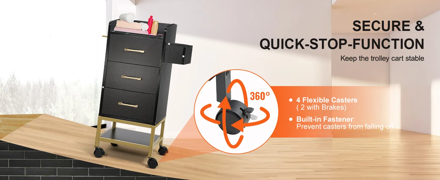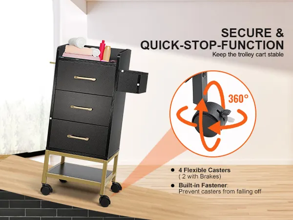 Equipada con cuatro ruedas giratorias de 360°, incluidas 2 con frenos confiables, nuestra estación de herramientas de peluquería ofrece maniobrabilidad y estabilidad sin esfuerzo. Ya sea para navegar por espacios reducidos de estudio o para mantener la estabilidad durante el trabajo intenso, este carrito satisface sin esfuerzo sus necesidades.