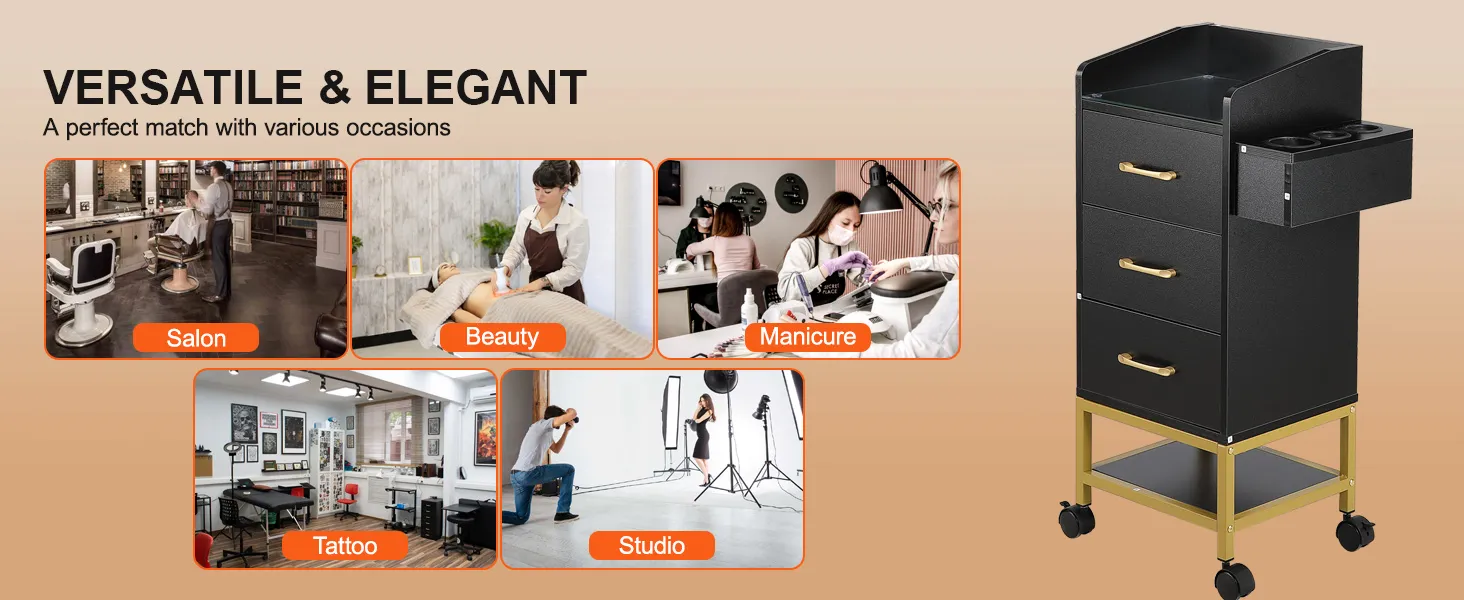 Ya sea para peluquerías, spas de belleza, estudios de manicura o salones de tatuajes, nuestro gabinete con ruedas para estaciones de peluquería se adapta perfectamente a cualquier entorno. Su apariencia elegante mejora la estética general y agrega un toque de lujo y profesionalismo a su espacio de trabajo.