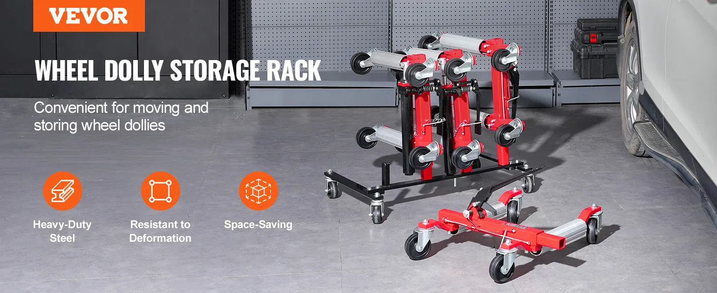 Este soporte para carritos de transporte para automóvil, fabricado en acero resistente, es fuerte y resistente a deformaciones o daños. Admite hasta 4 carritos de transporte con ruedas a la vez. Equipado con ruedas giratorias de 360°, garantiza un movimiento flexible. Nota: El producto es solo el soporte de almacenamiento y no incluye carritos de transporte con ruedas.