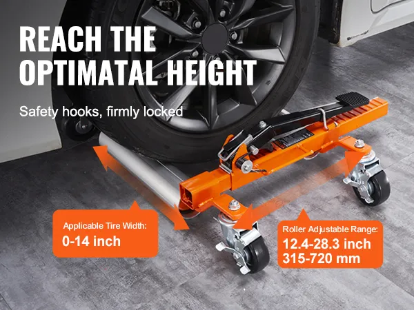 Gama versátil de aplicaciones: se adapta a vehículos con un ancho máximo de llanta de 14"/355,6 mm y un tramo de rodillo de 12,4" a 28,3"/315-720 mm, la plataforma rodante para ruedas se adapta a varios tipos de vehículos y permite un movimiento rápido del automóvil, llanta cambios, reparaciones y más, el conveniente diseño del mango garantiza un fácil almacenamiento en su garaje o baúl, brindando asistencia confiable cuando sea necesario.