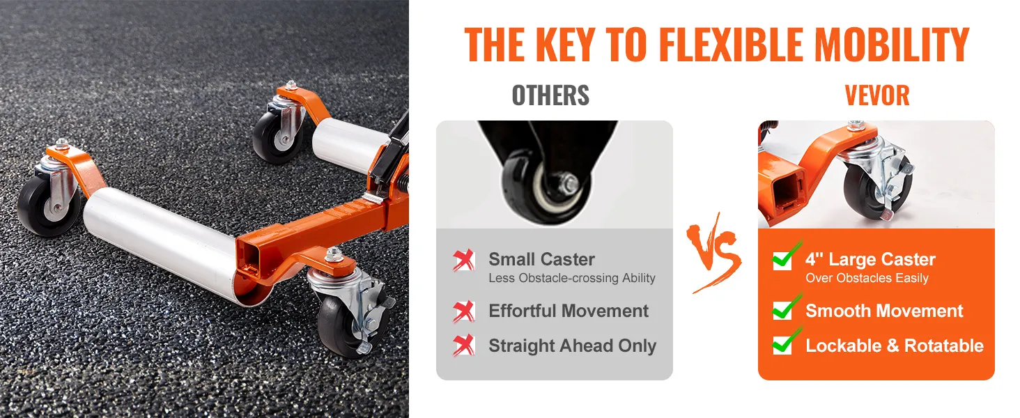 Móvil y bloqueable: Equipado con ruedas universales con rodamientos de rodillos de 4 pulgadas/10 cm y ruedas con bloqueo confiable, garantiza un movimiento suave con el mínimo esfuerzo y puede confiar en que las ruedas no se aflojarán. Empuja tu vehículo sin esfuerzo y sin depender de la potencia del motor. Cuando necesite mantener su automóvil en su lugar, simplemente presione el freno de pie para bloquear instantáneamente la posición, asegurando la estabilidad.