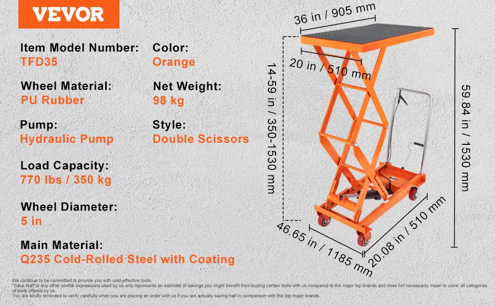 Capacidad de carga de 350 kg: ¡realice una variedad de tareas de elevación con confianza! Nuestro carro de tijera hidráulico está diseñado para soportar cargas de hasta 350 kg. Las tijeras y la plataforma están hechas de acero de gran calibre de primera calidad con una superficie con recubrimiento en polvo resistente a la oxidación. Esto garantiza durabilidad y estabilidad a largo plazo al manipular objetos pesados, haciendo que su trabajo sea fácil, eficiente y seguro.