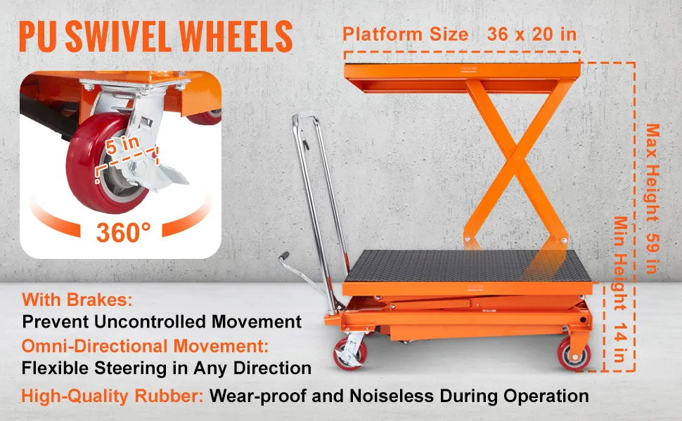 Fácil movilidad: nuestra mesa elevadora hidráulica está equipada con ruedas giratorias de PU que giran en múltiples direcciones, lo que garantiza una movilidad suave y cómoda. El mecanismo de bloqueo asegura el carro de forma segura en su lugar, evitando movimientos inesperados durante el transporte. Con ruedas de PU resistentes al desgaste y a la corrosión, puede contar con un rendimiento duradero y la capacidad de manejar cargas pesadas.
