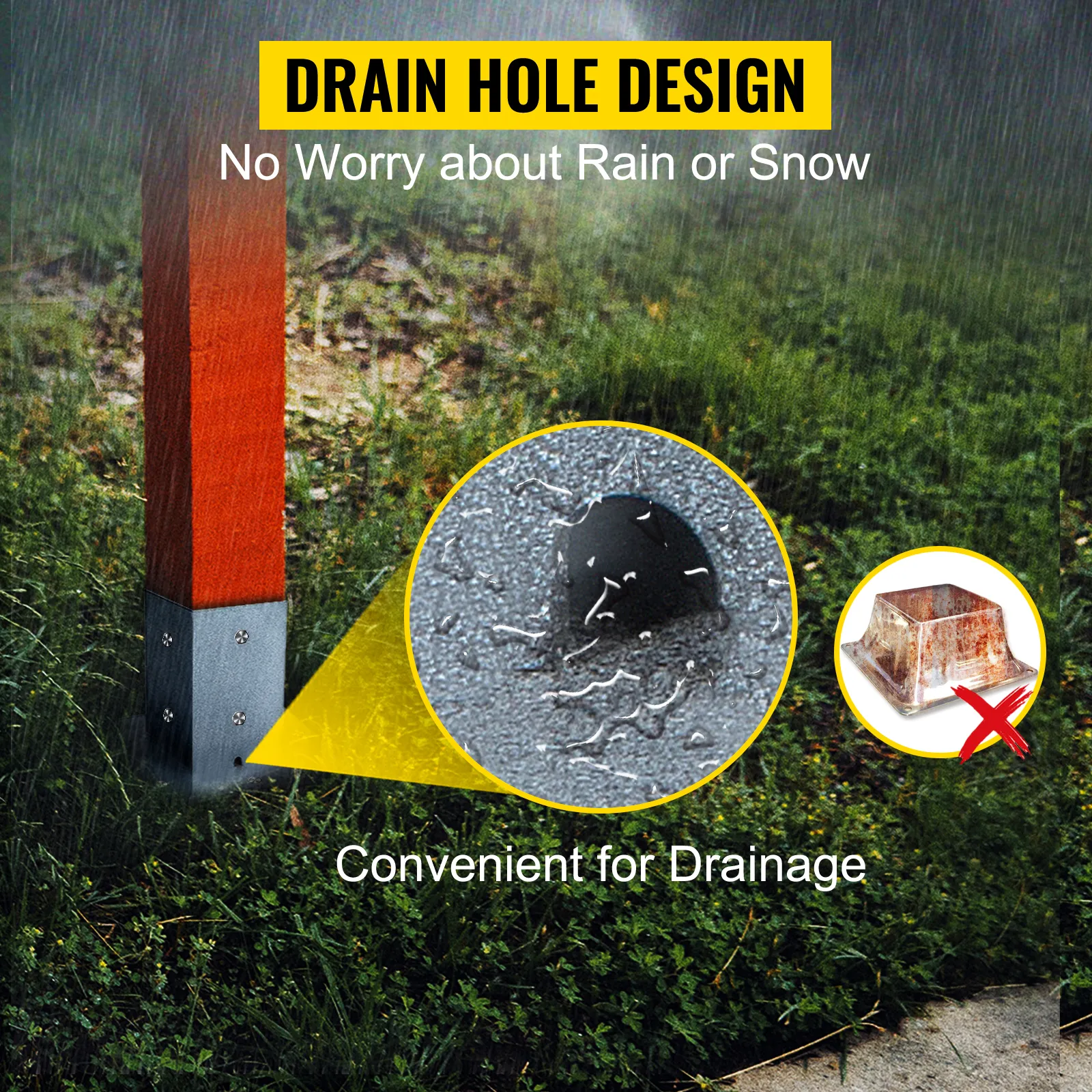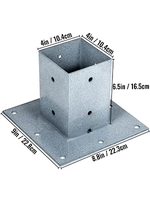 Gracias al orificio de drenaje en la parte inferior, nuestra placa base de poste es conveniente para el drenaje. El agua se puede drenar fácilmente, por lo que no hay que preocuparse por la lluvia o la nieve.