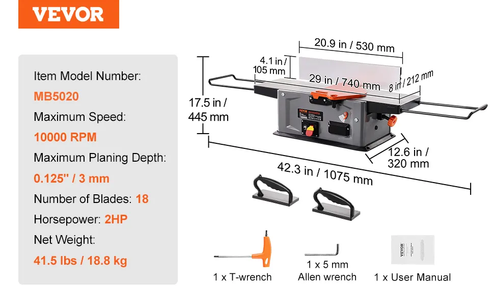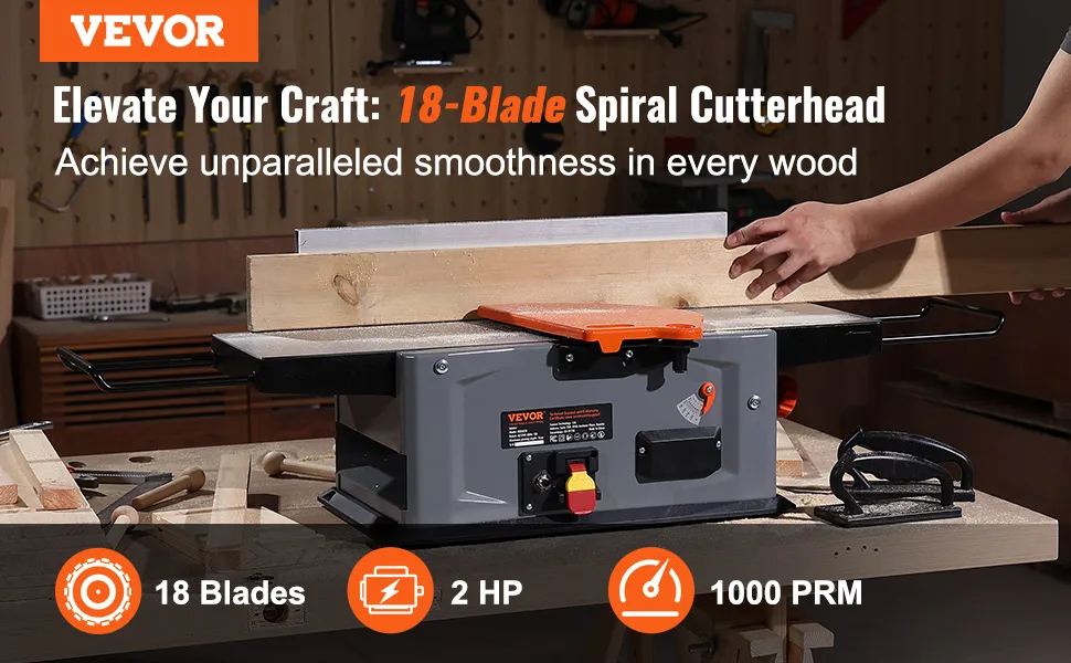 Power Unleashed: Dive into your projects with the unstoppable power of our 2HP motor, soaring up to 1000 RPM for unmatched efficiency. From softwoods to hardwoods, our spiral benchtop jointer powers through with unparalleled precision and speed, turning every planing task into a masterpiece of woodworking artistry.