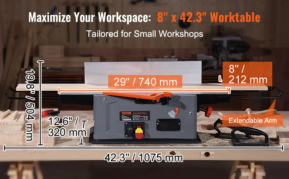Spacious Work Area: With the extendable arms unfolded, our benchtop wood jointer offers a maximum working size of 8'' x 42.3'', providing ample space for effortlessly handling large wood pieces. Ideal for tackling substantial projects, the jointer can be conveniently retracted to minimize space usage, making it easy to move around.
