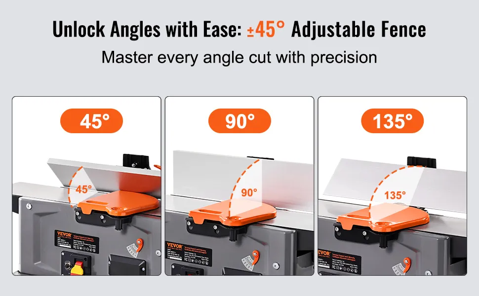 ±45°Adjustable Fence: Ready to craft woodworking projects that stand out with uniqueness and personal flair? With our adjustable fence offering angles from ±45°, you can effortlessly switch between vertical and beveled planing. This versatility opens up a world of possibilities, allowing you to diversify your woodworking projects.