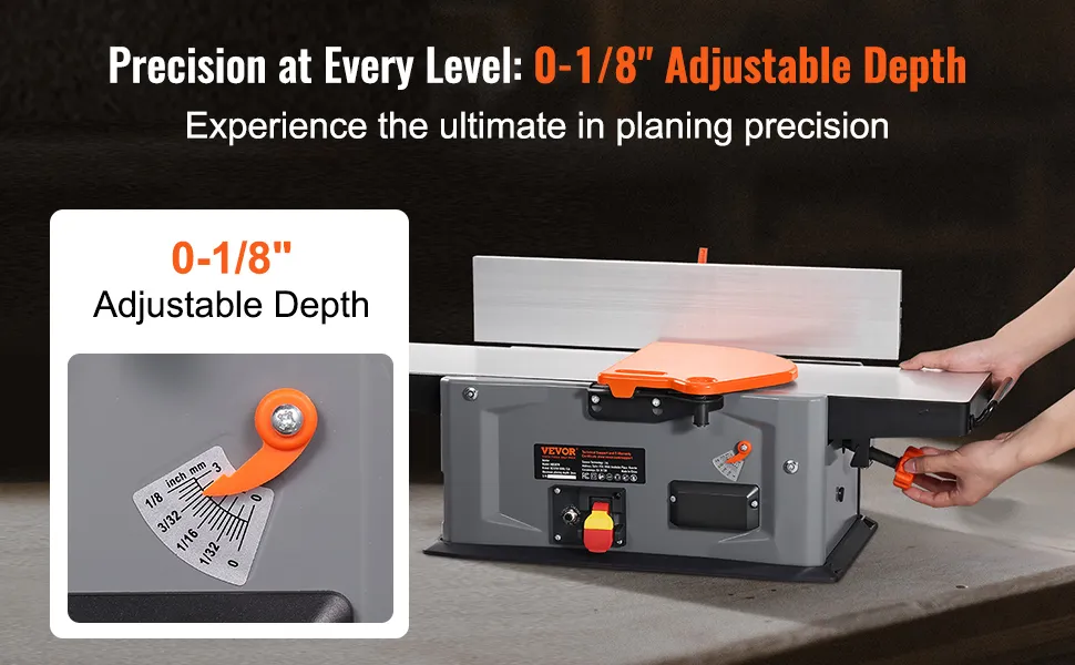 Adjustable Planing Depth: Our benchtop jointer brings you the flexibility of 0-1/8" depth adjustment, catering to a broad spectrum of woodworking tasks—from rough dimensioning to fine finishing. Maximize material efficiency and cut down on waste, ensuring each pass is precise. Elevate your craftsmanship with the power of precision at your fingertips.