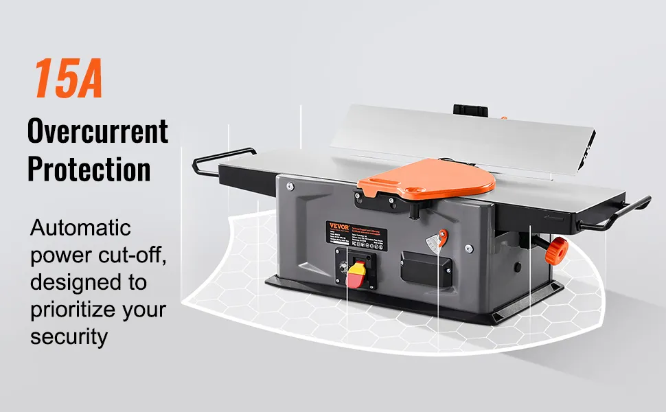 Our bench top jointers woodworking comes with a built-in 15A overcurrent protection, ensuring your workspace remains secure at all times. With an automatic protection mechanism that activates in the event of electrical overload, you can work with peace of mind!
