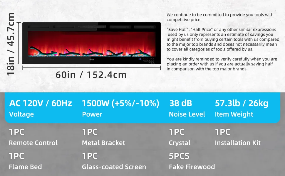 Llama realista y atractiva: Tamaño del producto: 60 x 4,57 x 18 pulgadas (152,4 x 11,6 x 45,7 cm). Potencia: 1500 W. Gracias a su pantalla construida con revestimiento de vidrio, la chimenea eléctrica le brindará una visión realista de las llamas. Además, una pantalla a gran escala magnifica perfectamente la llama "ardiente" oscilante. Se proporcionan múltiples combinaciones de 12 colores de llama, 5 velocidades de llama y 5 brillos para crear el ambiente. Viene con cristal y leña artificial para añadir un ambiente más acogedor y vivo.