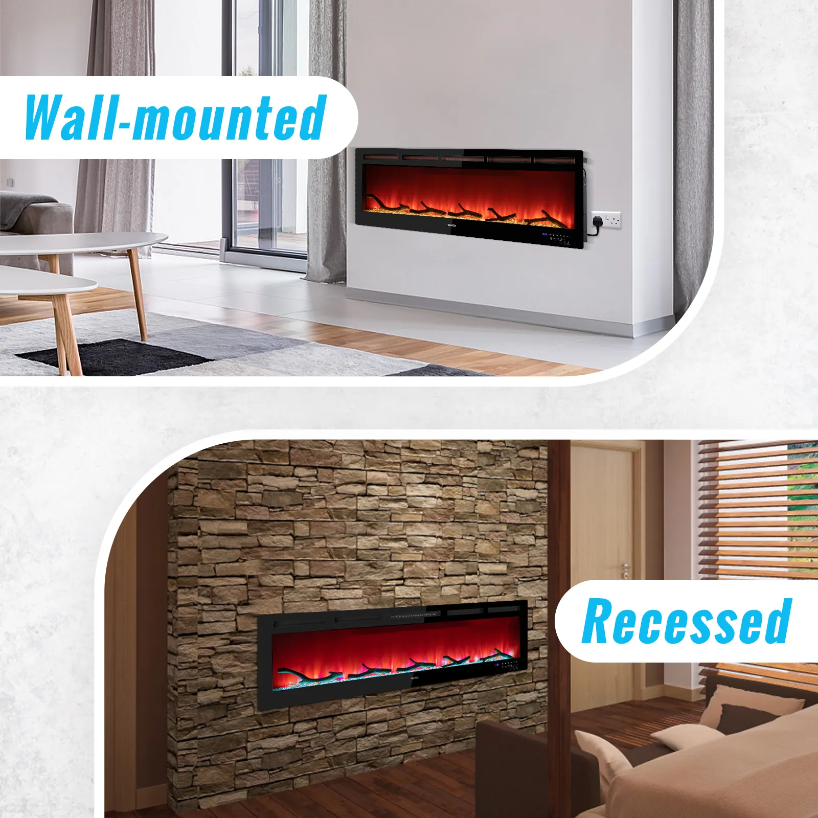 Montado en la pared y empotrado: se adapta perfectamente a montantes de 2 x 4 y 2 x 6 en la pared. Nuestra chimenea de pared no solo tiene que estar empotrada en la pared. También se puede montar en la pared. También es compatible con la instalación por cable. Montarlo y fijarlo a la pared solo te costará unos minutos. Prepárate para disfrutar de un maravilloso festín visual. Nota: Recomendamos que se deje algo de espacio entre la parte superior de la chimenea y el televisor, la repisa de la chimenea y el techo con cuadro.