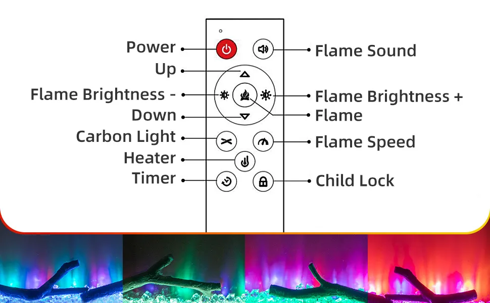 Modos de operación múltiple: para garantizar una buena experiencia de usuario, puede encender nuestra chimenea eléctrica de 2 maneras. Las pantallas remotas y táctiles hacen que sea más conveniente controlar todas las funciones de nuestra chimenea eléctrica. El modo de recuperación especial ahorra la molestia de tener que realizar configuraciones repetidas después de apagarlo.