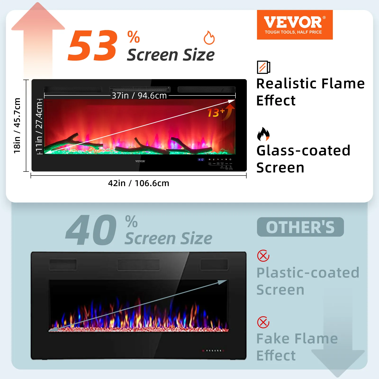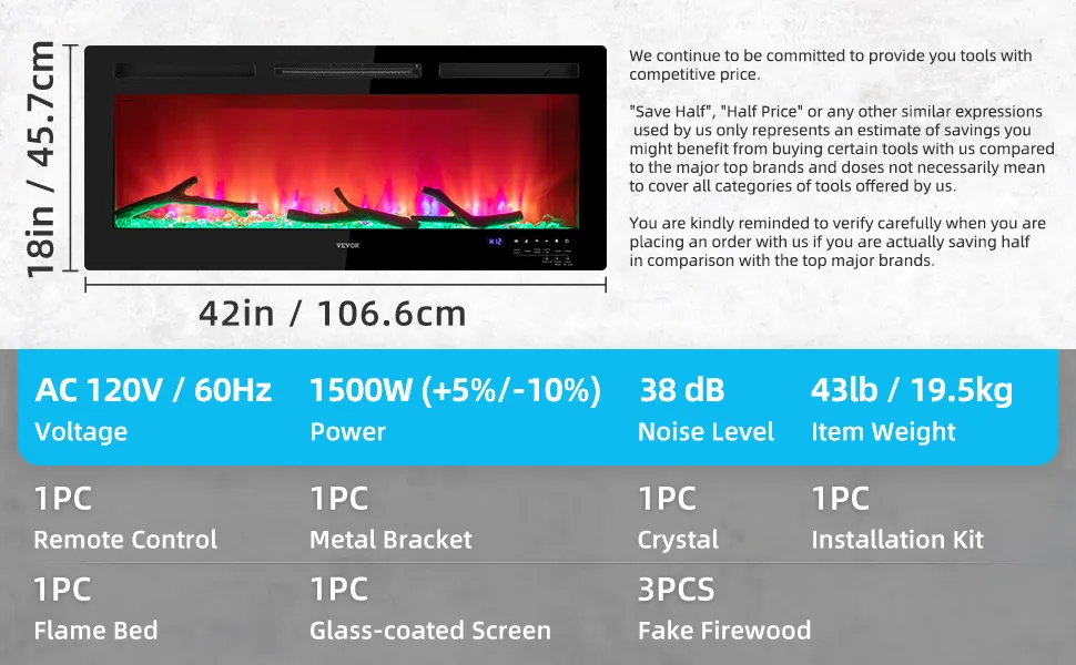 Llama realista y atractiva: Tamaño del producto: 42 x 4,57 x 18 pulgadas (106,6 x 11,6 x 45,7 cm). Potencia: 1500 W. Gracias a su pantalla construida con revestimiento de vidrio, la chimenea eléctrica le brindará una visión realista de las llamas. Además, una pantalla a gran escala magnifica perfectamente la llama "ardiente" oscilante. Se proporcionan múltiples combinaciones de 12 colores de llama, 5 velocidades de llama y 5 brillos para crear el ambiente. Viene con cristal y leña artificial para añadir un ambiente más acogedor y vivo.