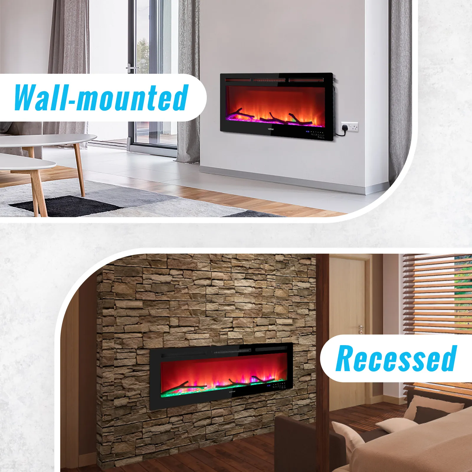Montado en la pared y empotrado: se adapta perfectamente a montantes de 2 x 4 y 2 x 6 en la pared. Nuestra chimenea de pared no solo tiene que estar empotrada en la pared. También se puede montar en la pared. También es compatible con la instalación por cable. Montarlo y fijarlo a la pared solo te costará unos minutos. Prepárate para disfrutar de un maravilloso festín visual. Nota: Recomendamos que se deje algo de espacio entre la parte superior de la chimenea y el televisor, la repisa de la chimenea y el techo con cuadro.