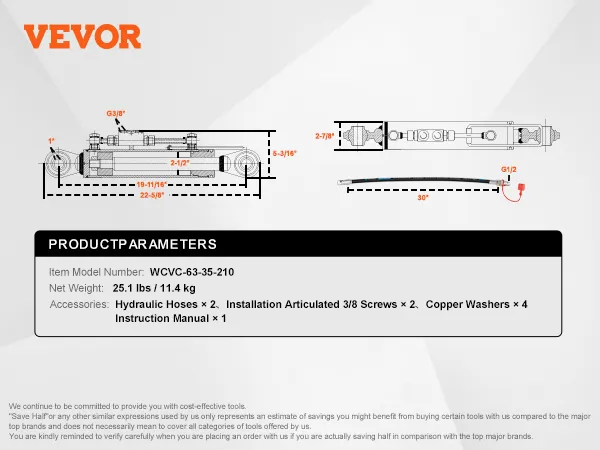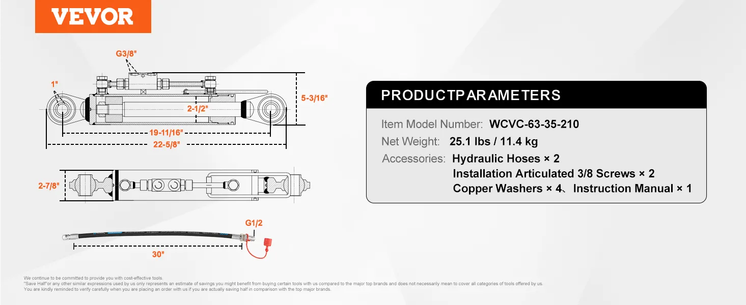 Adaptation for Cat. 2-2 Tractors: The hydraulic top link cat. 1-1's rod inlet/outlet diameter: 3/8 in; Min retracted length:19-11/16 in(500 mm); Stroke length: 8-5/16 in (211 mm); Hydraulic hose length: 30.1 in (765 mm). It can be directly installed on Cat. 1-1 tractors and is widely used in heavy-duty agricultural plowing, waste recycling, transportation, and other tasks.