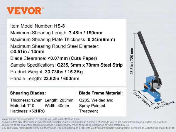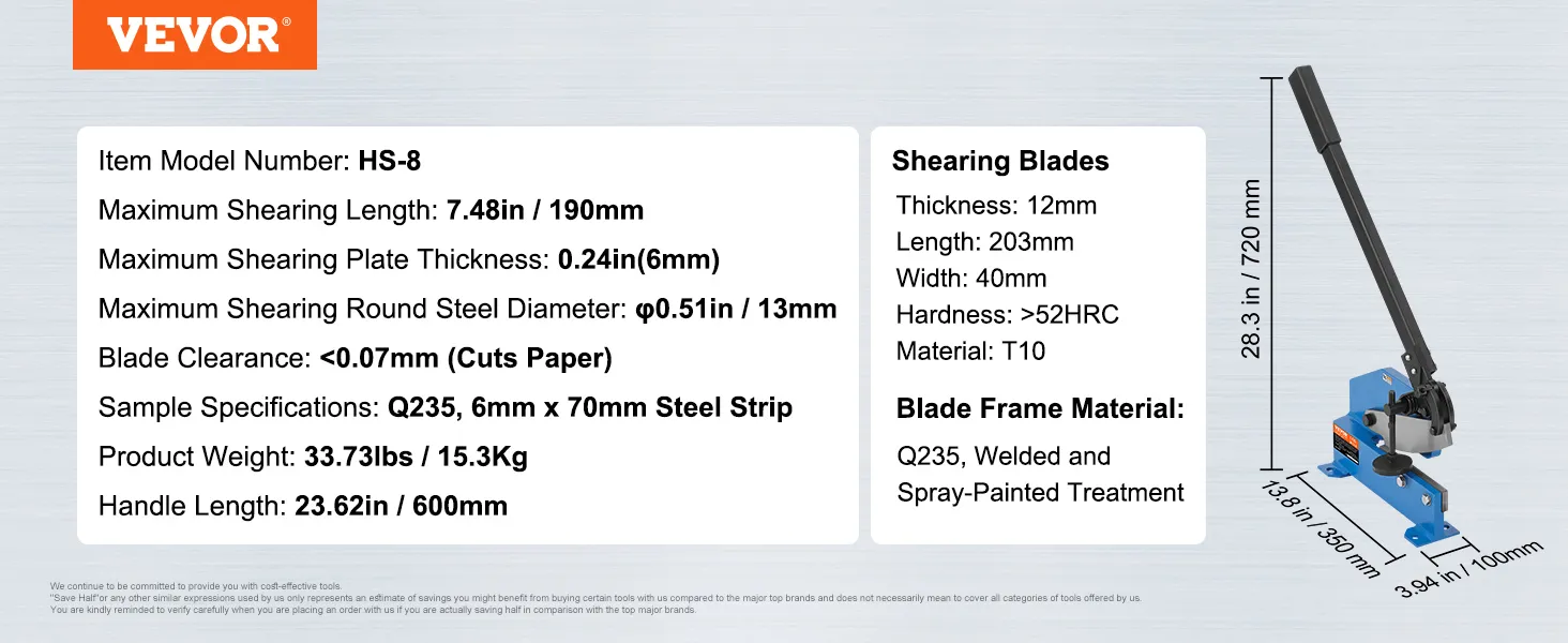 Cizalla manual VEVOR de 8" para procesamiento de chapa metálica, cortadora de sobremesa HS-8 con material Q235, ideal para trabajos manuales con acero grueso, prensa de rodillos de alta resistencia para constructores y aficionados al bricolaje.