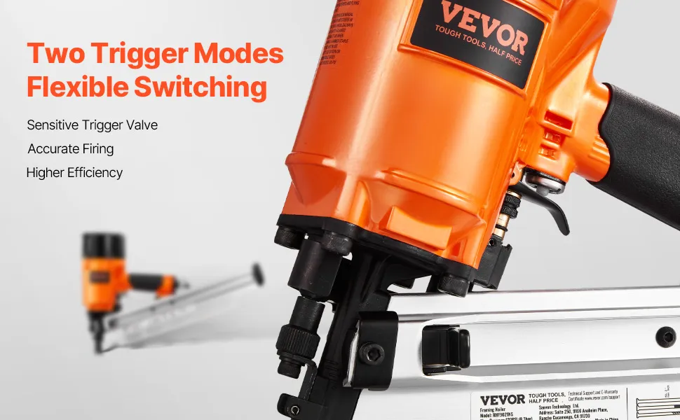 La pistola de clavos neumática de 21 grados cuenta con 2 modos de disparo: disparo secuencial y disparo por contacto, lo que permite un cambio flexible según sus necesidades. La válvula de disparo sensible garantiza un disparo preciso y eficiente, lo que mejora la eficiencia de su trabajo.