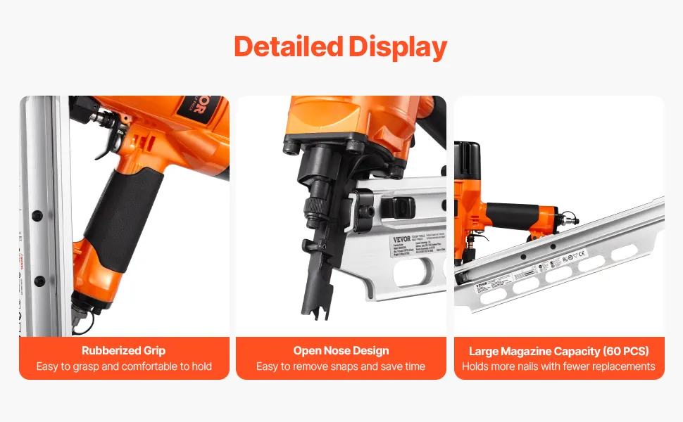 Alta compatibilidad: esta clavadora de cabeza redonda de 21° es compatible con 3 tipos de clavos: clavos de vástago liso, clavos de vástago anillado y clavos roscados, lo que satisface diversas necesidades de construcción. Clavos de vástago liso: longitud: 2"-3,5", diámetro: 0,113"-0,130"; Clavos de vástago anillado: longitud: 2"-3", diámetro: 0,113"-0,12"; Clavos roscados: longitud: 2"-3", diámetro: 0,113"-0,120".
