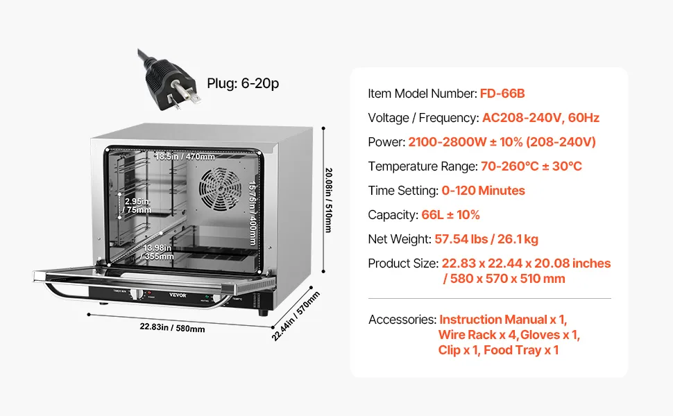 Horno comercial de encimera VEVOR, horno tostador de 66 L y 4 niveles con puerta de vidrio templado, rejillas y bandeja de alambre, horno de acero inoxidable de 2800 W para panaderías y restaurantes (CA 208-240 V, 60 Hz, enchufe y salida 6-20P)