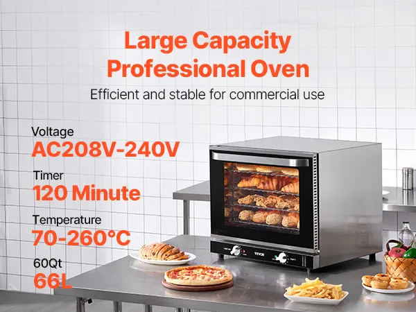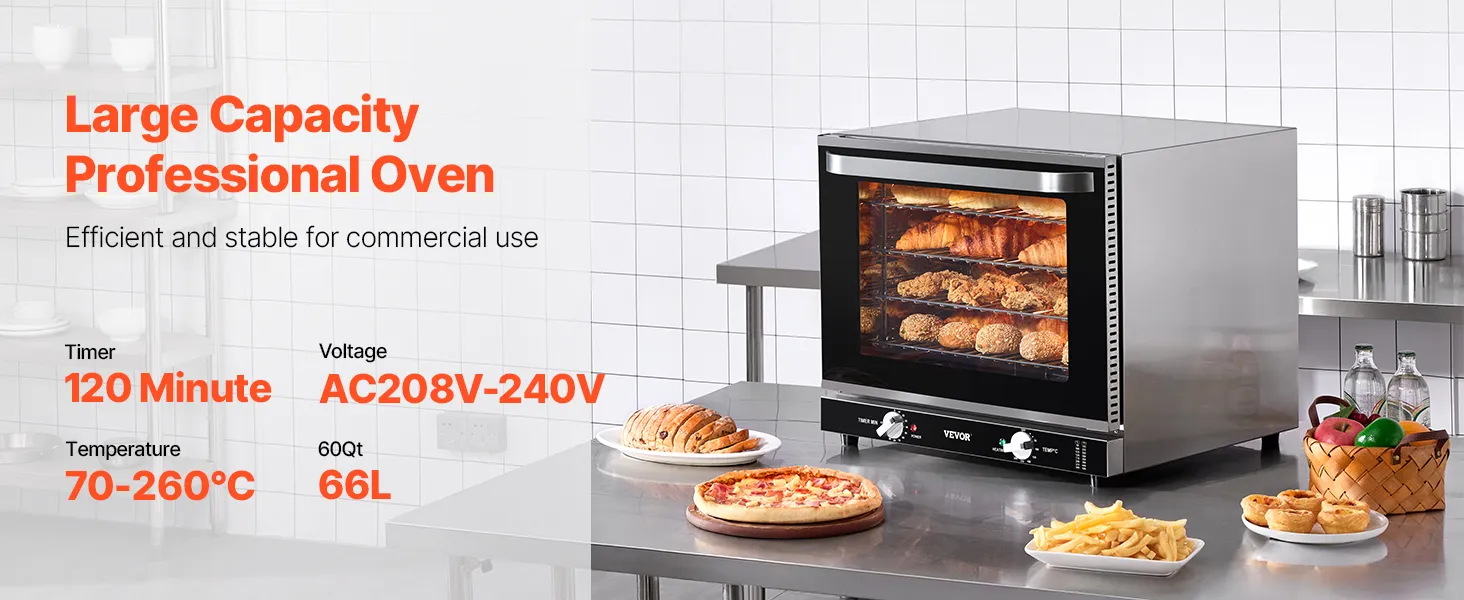 El horno comercial profesional de 66L está diseñado para un rendimiento confiable. Está equipado con características profesionales para uso comercial: gran capacidad, alta potencia, temporizador y temperatura ajustables, duradero y estable para uso diario.