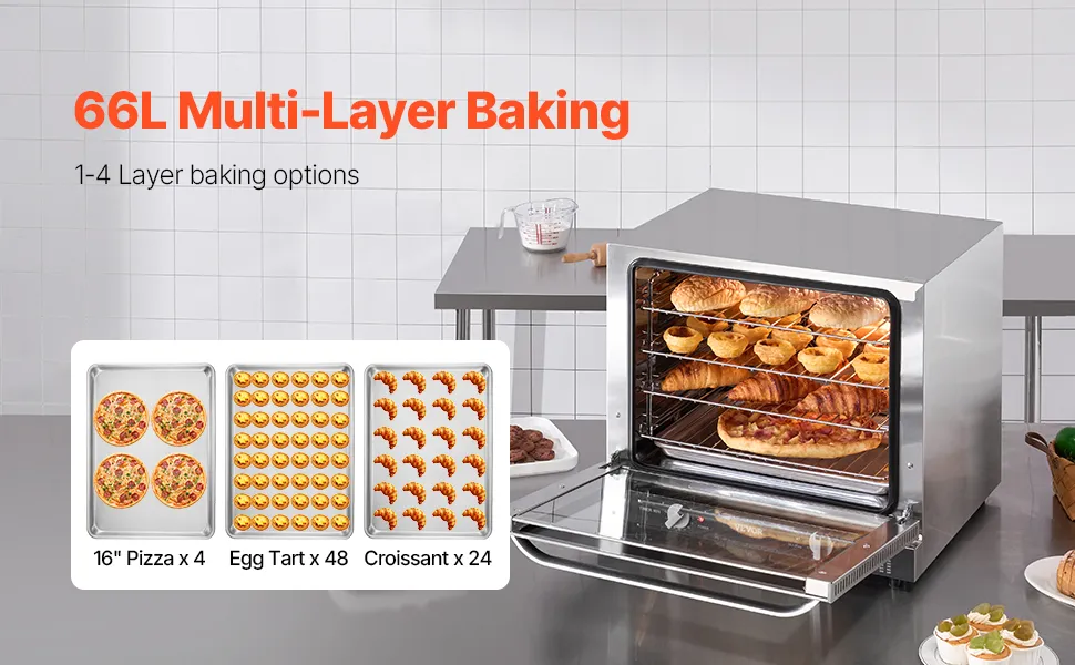 Gran capacidad de 4 niveles: este horno de encimera comercial ofrece una gran capacidad de 66 litros con 4 posiciones de rejilla, lo que le permite cocinar diferentes platos simultáneamente. Ideal para cocinas comerciales, catering y entusiastas de la repostería casera.