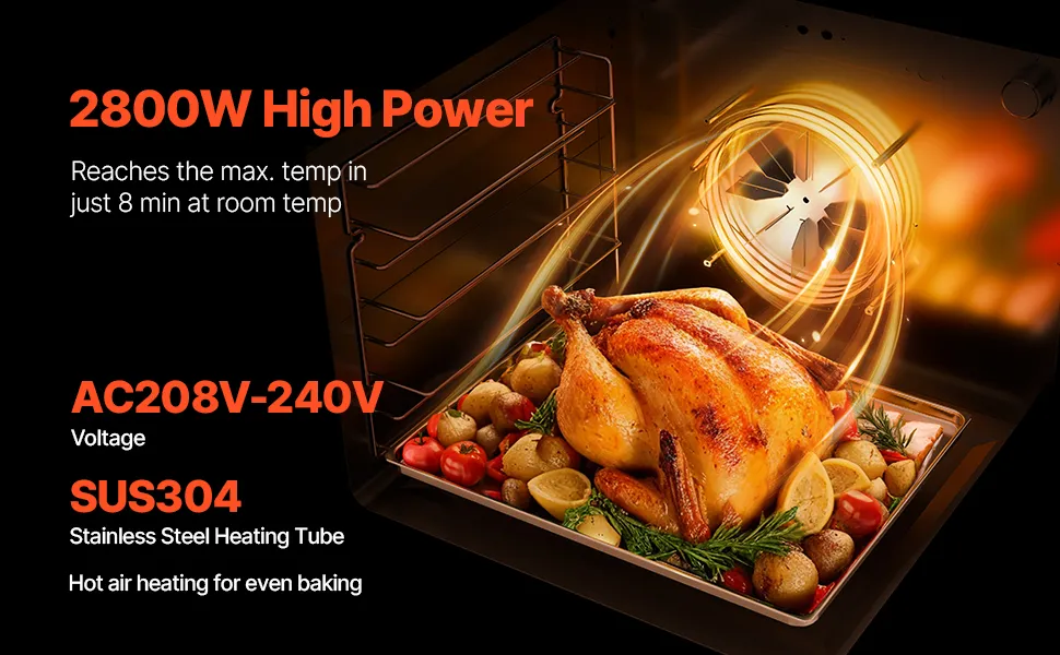 Calentamiento rápido y eficiente: con una potente capacidad de calentamiento de 2800 W, este horno tostador utiliza aire caliente para distribuir el calor de manera uniforme, lo que garantiza resultados de cocción uniformes y una apariencia excelente. No requiere ventilación externa, lo que lo hace fácil y seguro de usar.
