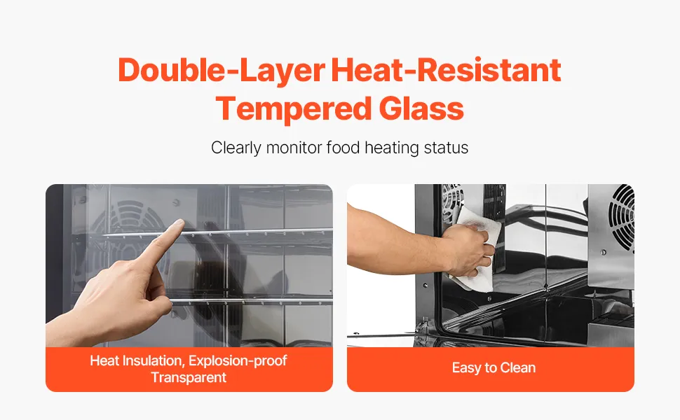Material de primera calidad: el cuerpo del horno está hecho de acero inoxidable de alta calidad, que es fácil de limpiar y mantener. Cuenta con vidrio templado de alta resistencia de doble capa, que ayuda a prevenir la pérdida de calor y las quemaduras, lo que le permite controlar claramente el progreso de la cocción de los alimentos.