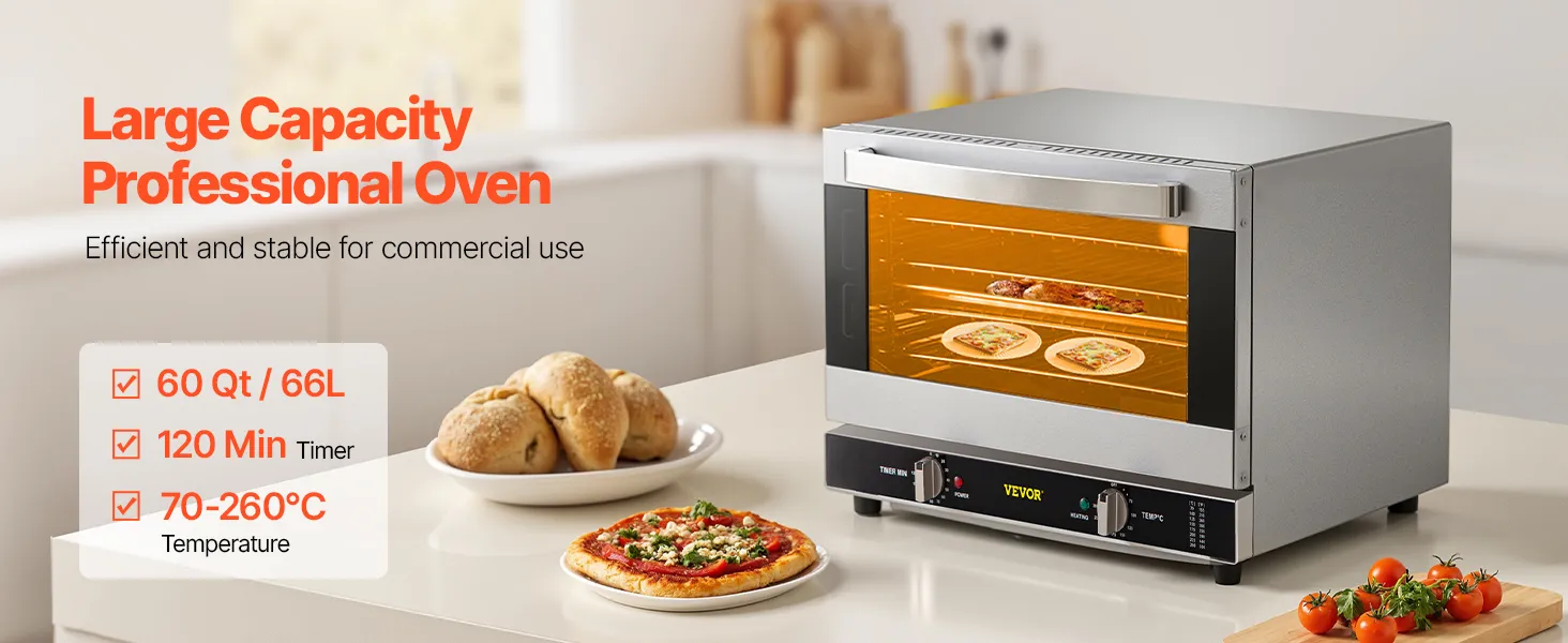 Nuestro horno de convección de tamaño medio, que hornea rápidamente grandes cantidades de comida deliciosa, pretende convertirse en su ayudante confiable sin ocupar demasiado espacio en su cocina. Su cuerpo compacto incluye una gran cantidad de funciones útiles, incluido un interior espacioso antiadherente, una puerta frontal bien construida, un ventilador silencioso y rejillas de alambre y bandeja para alimentos completas. Es perfectamente adecuado para hornear pizzas, pasteles, pan, sándwiches, pollos y otros bocadillos directamente en la encimera y se aplica ampliamente en cafeterías, quioscos, cafeterías, restaurantes, etc.
