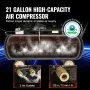 Tanque de aire de gran capacidad: Su gran capacidad de 21 galones proporciona un suministro de aire estable y de mayor duración. Combinado con dos salidas de aire, permite usar dos herramientas simultáneamente. El suministro de aire estable y duradero reduce los arranques y paradas frecuentes, garantizando la fluidez de sus proyectos de principio a fin.