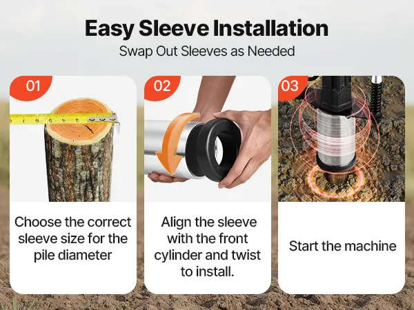 Three Interchangeable Sleeves: The gas powered t post driver comes with three different sleeve sizes (45mm, 55mm, and 88mm) for versatile use. You can easily swap sleeves depending on the post size, ensuring the excellent performance for each job