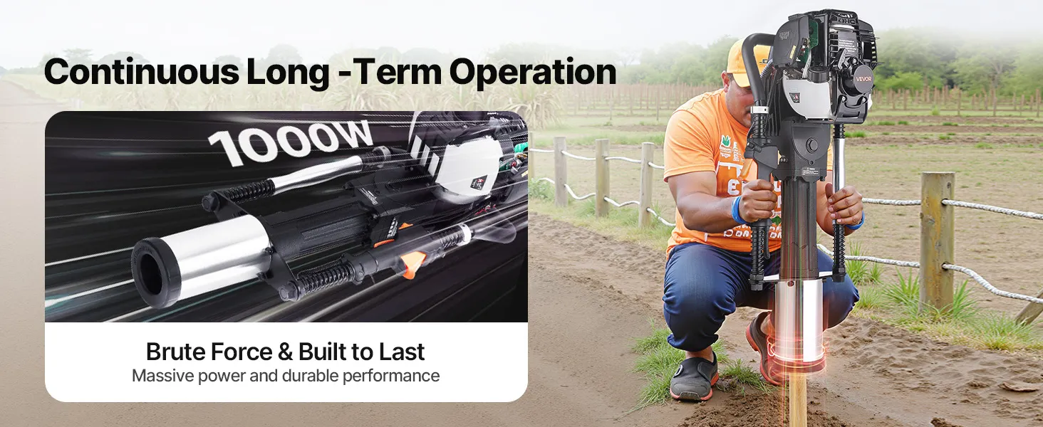 Powerful 4-Stroke Engine: Our post driver is built with a sturdy aluminum alloy engine that delivers 1000W of power, running at 6500 RPM. Provides smooth operation with high fuel efficiency and low vibration for optimal piling performance