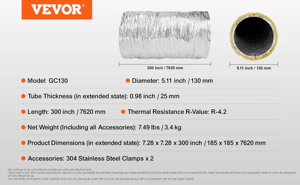 Manguera de ventilación para secadora VEVOR, conducto flexible aislado de 5'' y 25 pies de largo con 2 abrazaderas, protección de tres capas resistente para sistemas de climatización, calefacción, refrigeración, ventilación y escape, con resistencia al fuego R-4.2.