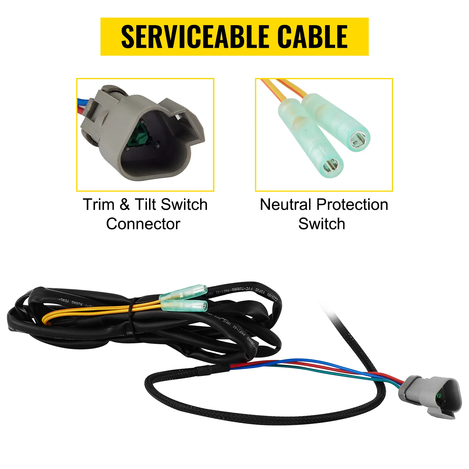 Arnés de ajuste duradero: el cable de control presenta resistencia a altas temperaturas, aislamiento termoplástico y una codificación de colores notable. El mazo de cables contiene un conector del interruptor de trimado/inclinación y un interruptor de protección de punto muerto. Un cable reparable facilita el uso remoto de energía.