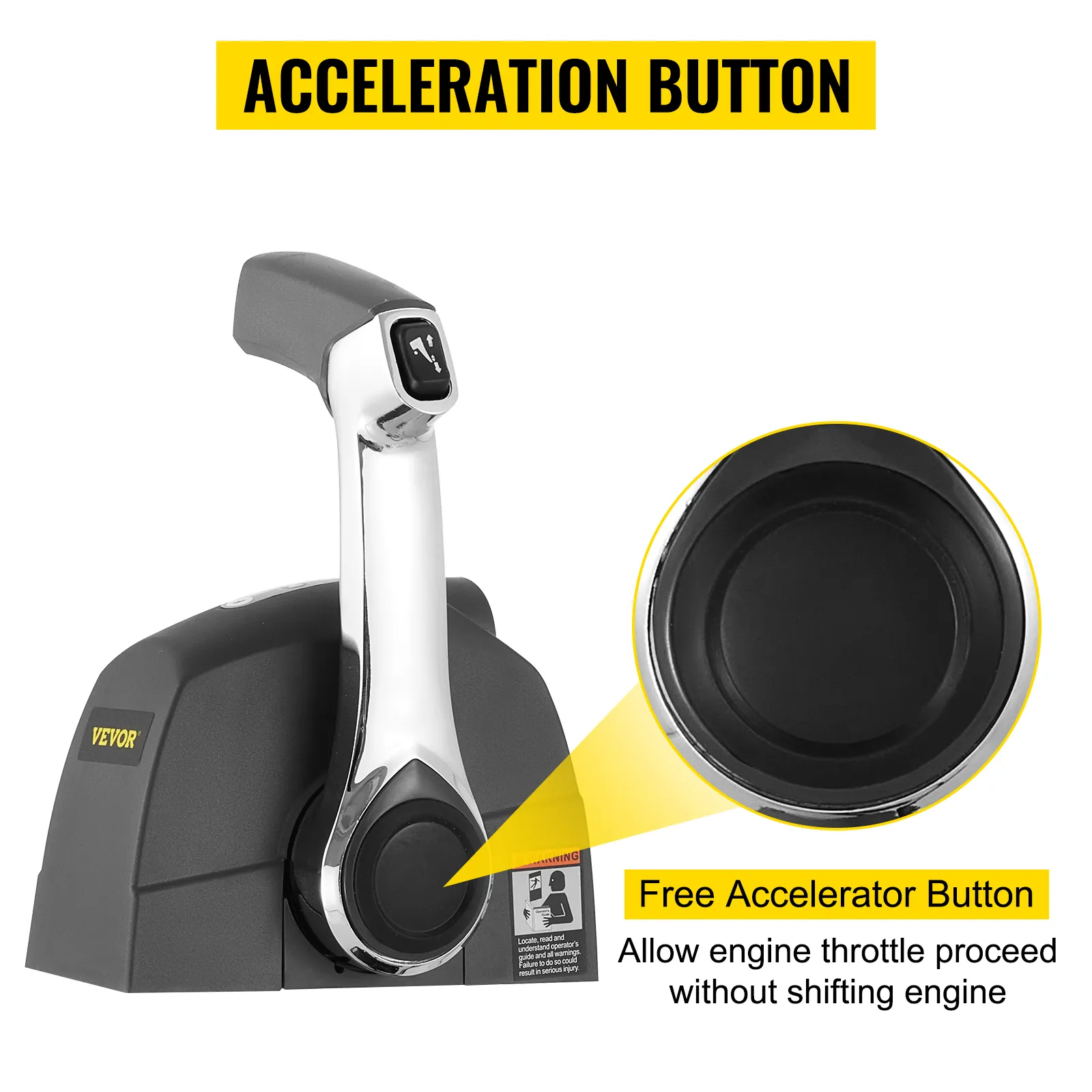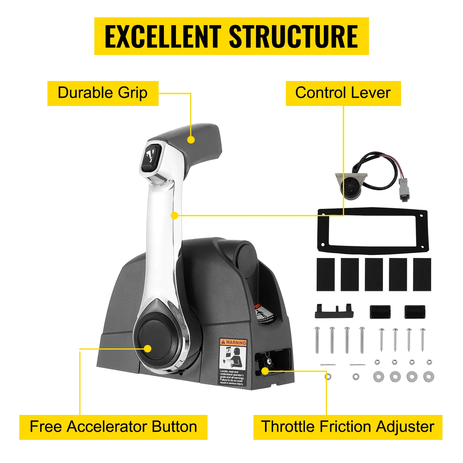 El kit de control remoto externo tiene una estructura estable y razonable. La palanca de control duradera, el interruptor de trimado/inclinación, el botón de acelerador libre y el ajustador de fricción del acelerador están diseñados para controlar la embarcación sin problemas.