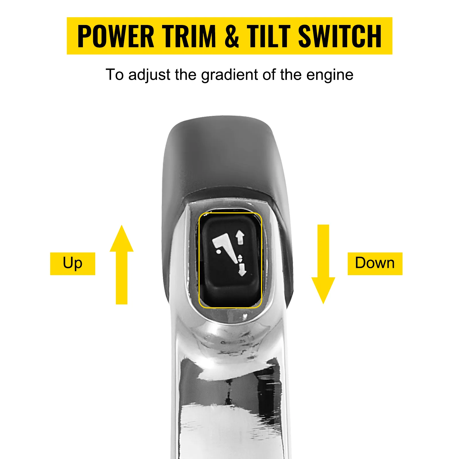 Diseños ergonómicos: el sistema de inclinación y trimado eléctrico puede ajustar el ángulo del motor fuera de borda. Presione el interruptor "hacia arriba", el motor fuera de borda se inclina y sube; Presione el interruptor "abajo" y el motor fuera de borda se inclina y baja. Y coloque la palanca de control en punto muerto, presione el botón del acelerador libre y gire la palanca de control. El acelerador se puede abrir sin cambiar a ninguna marcha.