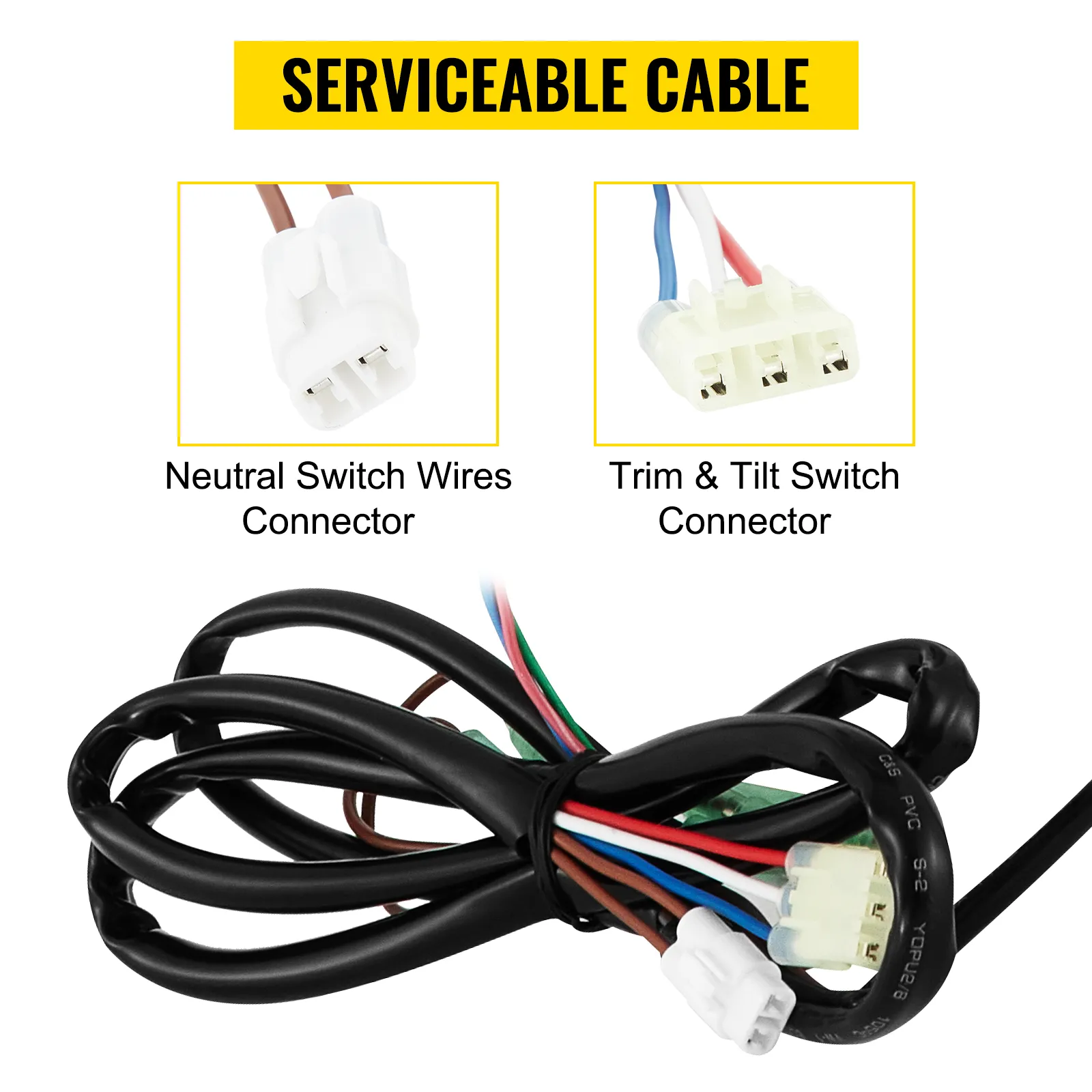 Arnés de ajuste duradero: el cable de control presenta resistencia a altas temperaturas y una codificación de colores notable. El mazo de cables contiene un conector de cables del interruptor de punto muerto y un conector del interruptor de trimado e inclinación. El cable reparable facilita el uso remoto de energía.